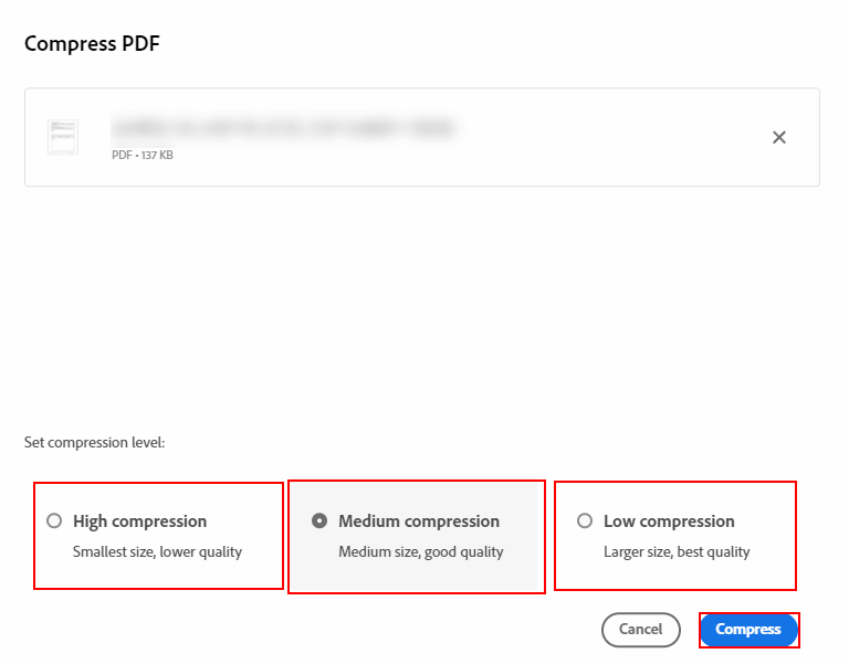 이 세 가지 옵션 중 하나를 선택하고, 우측 하단의 'Compress' 버튼을 클릭합시다.