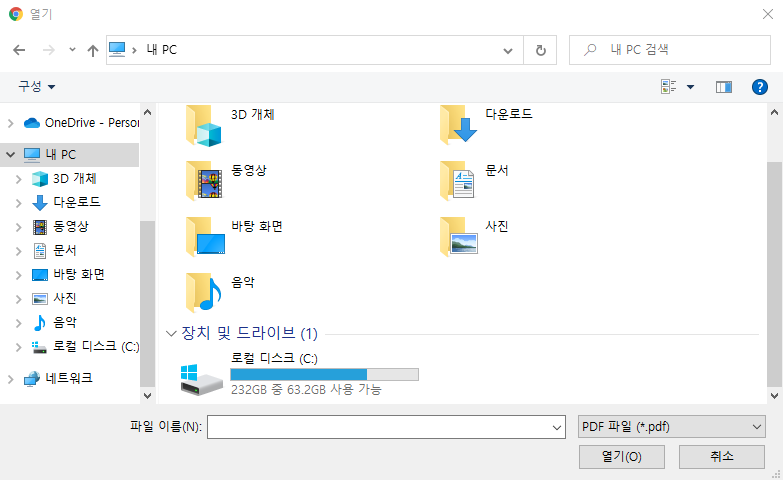 여기서 용량을 줄일 PDF파일을 선택하고, 우측 하단의 '열기(O)' 버튼을 클릭하면 됩니다.또는 이렇게 굳이 'Select a file' 버튼을 클릭해서 이 창을 열지 않고,파일 관리자 앱에서 PDF 파일을 그 중앙 부분에 끌어다놓아도 됩니다.