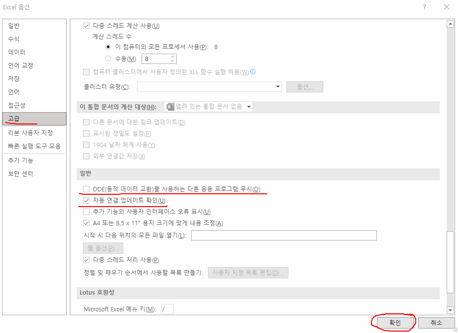 DDE~는 체크해제해서 비활성화하고, '자동 연결 업데이트 확인(U)'은 체크해서 활성화시키면 됩니다.