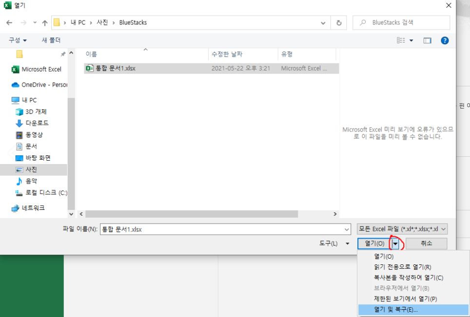 엑셀 파일이 안열릴때 해결 방법 첫번째