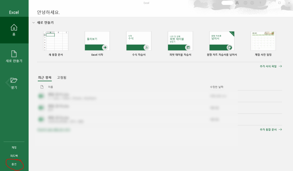 일단 위의 사진처럼 엑셀을 실행해주세요. 엑셀 파일은 안열려도 프로그램은 실행이 되죠.
