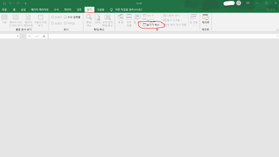 이외에는 엑셀 문서 또는 시트를 숨기는 설정을 했을 수도 있습니다.