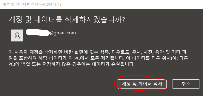 아직 삭제를 하지 말아주세요. '제거' 버튼을 클릭하면, 위의 사진처럼 '계정 및 데이터를 삭제하시겠습니까?' 창이 나옵니다.