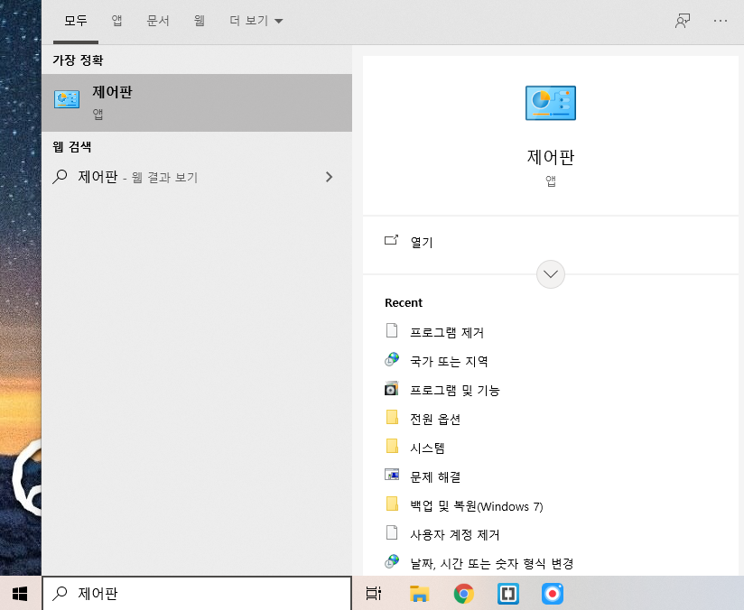 좌측 하단 검색창에 '제어판'이라고 입력을 하고, 첫번째로 나오는 '제어판'을 실행해주세요.