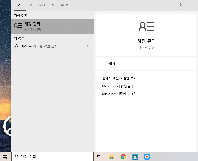그 검색창에 '계정 관리'라고 입력을 하고, 첫번째로 나오는 시스템 설정인 '계정 관리'를 클릭해서 실행해주세요.