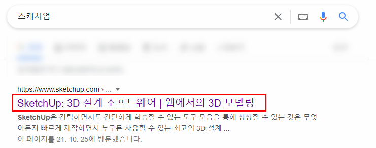 여기서 위의 사진처럼 공식 'SketchUp' 페이지가 검색 결과로 나올 겁니다. 해당 페이지로 이동을 해주세요.