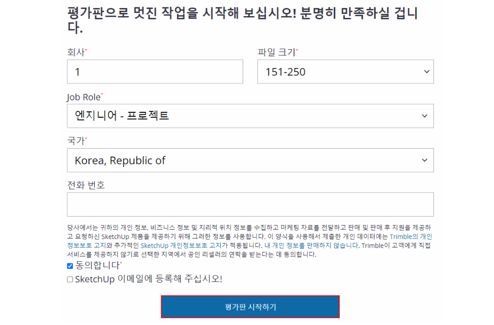 좌측 하단의 'SketchUp 이메일에 등록해 주십시오!' 체크박스는 체크해도 되고 안 해도 됩니다.