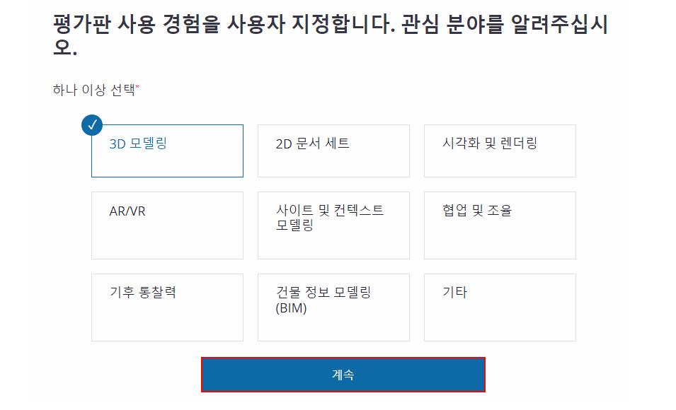 그 선택지를 클릭해서 자신에게 맞는 것을 선택하고, 다 선택했으면 하단의 '계속' 버튼을 클릭하면 됩니다.