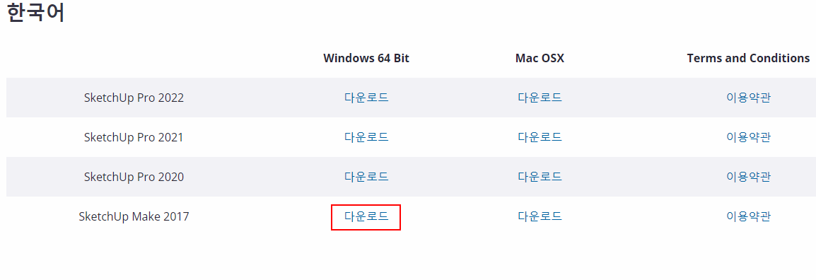 이 항목에서 'SketchUp Make 2017' 행의 내 컴퓨터 OS에 맞는 '다운로드' 버튼을 클릭합시다.