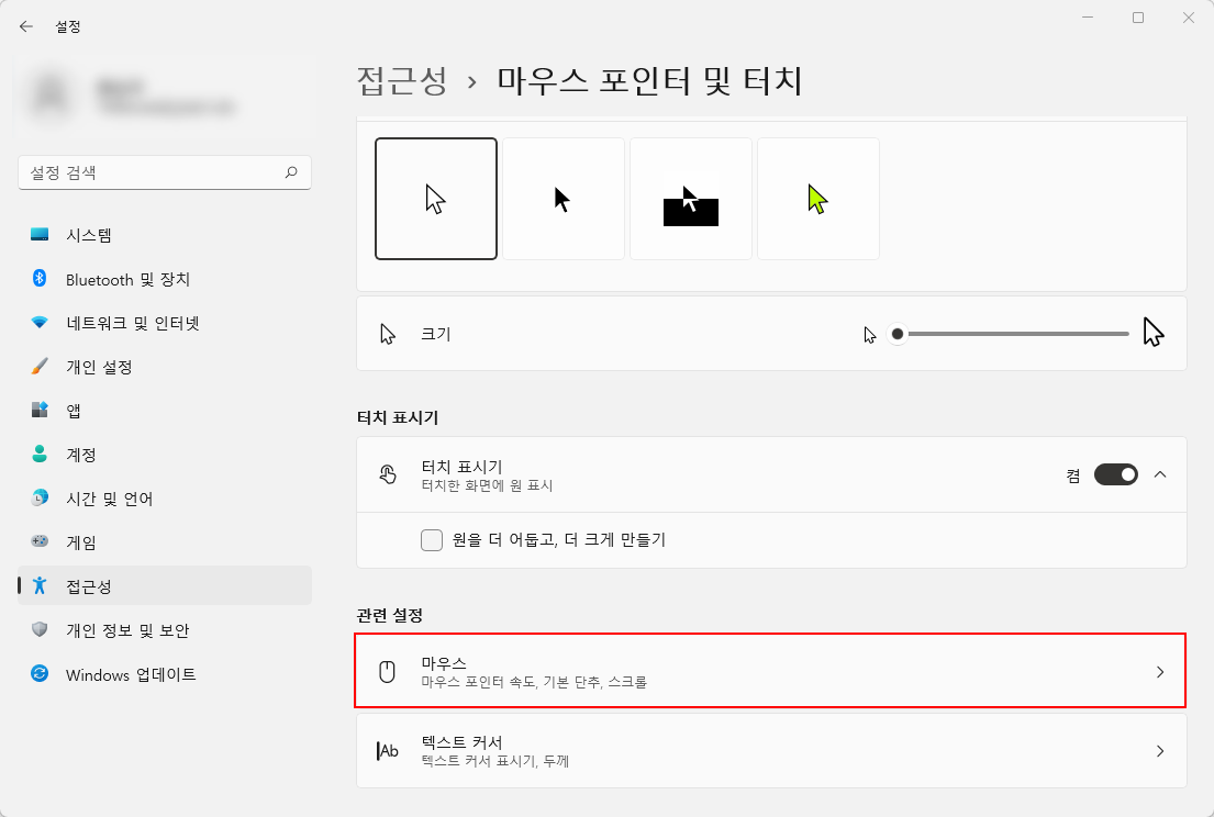 이 항목의 '마우스 포인터 및 터치' 옵션을 클릭해주세요.