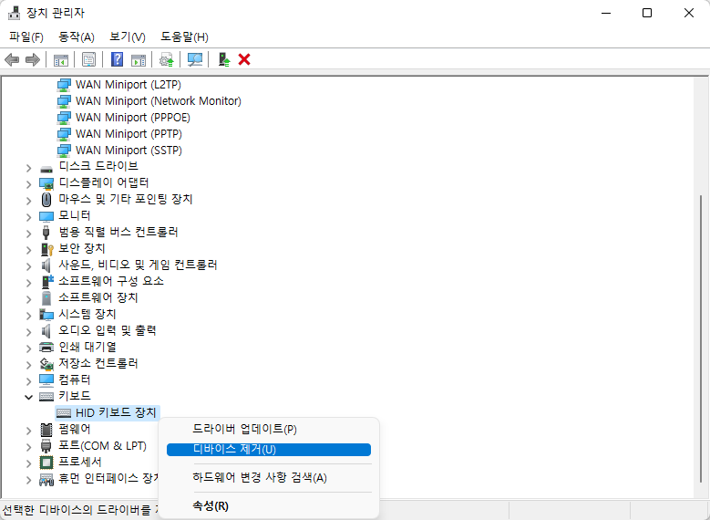 그리고 다시 '장치 관리자' 창으로 돌아와서, 키보드 하위 드라이버에 우클릭을 합시다.