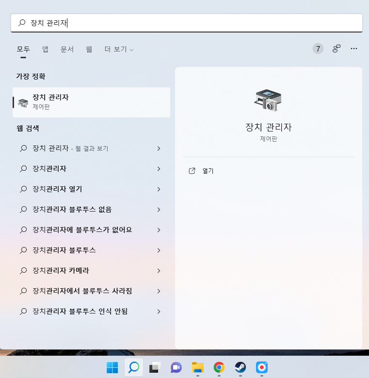 그러면 검색 결과로 '장치 관리자' 제어판 설정이 나올텐데, 이를 실행해주세요.