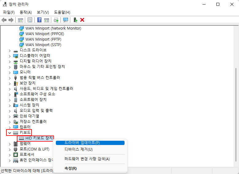 그 하위 키보드 드라이버에 우클릭을 하고, '드라이버 업데이트(P)' 탭을 클릭해주세요.
