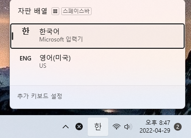 이외에도 키보드의 '윈도우 로고'키 + 스페이스바를 눌러서 한영전환을 하는게 가능합니다.