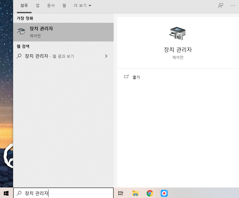 그러면 검색 결과로 '장치 관리자' 제어판 설정이 나오는데, 그걸 실행해주세요.
