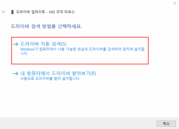 클릭해보면 위의 사진과 같은 '드라이버 업데이트 - (마우스 드라이버 이름)' 창이 나올 겁니다.