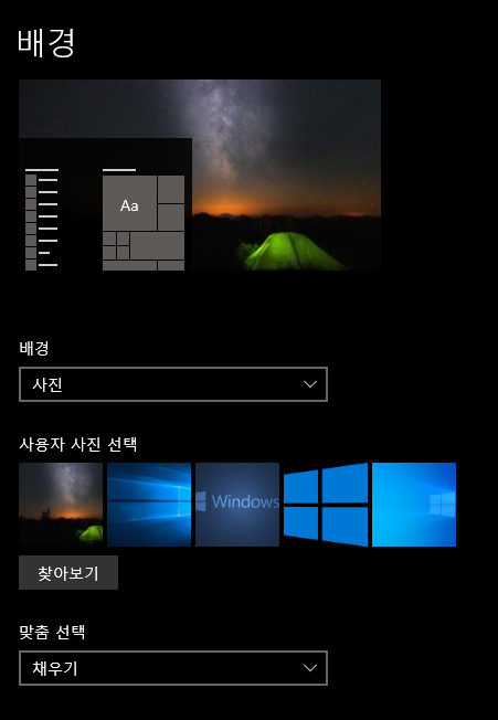 3. 배경 설정창으로 오면 사용자 사진 선택 밑에 있는 찾아보기를 클릭합니다.