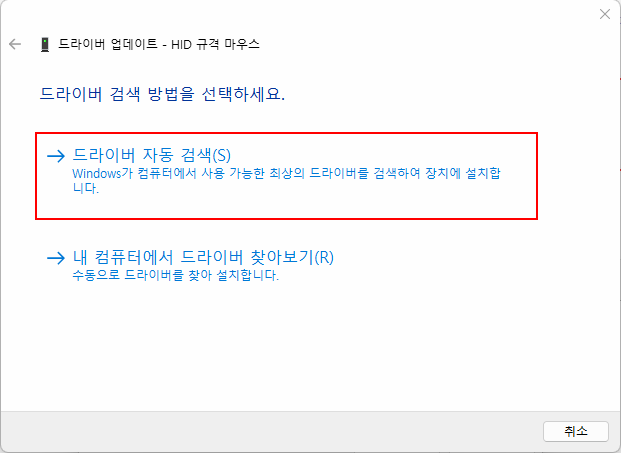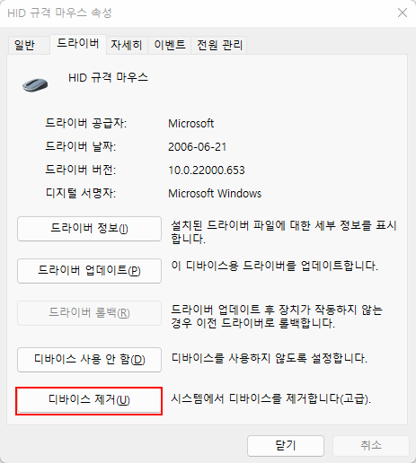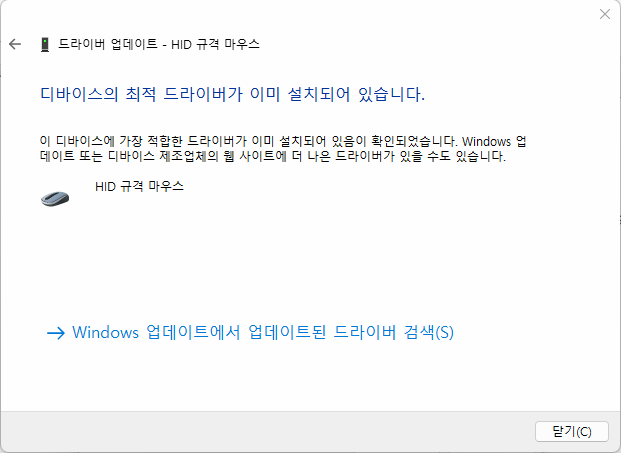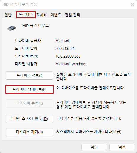 이 상태에서 마우스 USB를 뺐다가 다시 꽂으면 드라이버가 새로 설치가 됩니다.