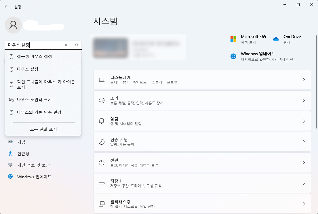 윈도우10은 '시스템' 항목으로 이동해서 마우스 설정을 하는 위치로 이동할 수 있을 겁니다.