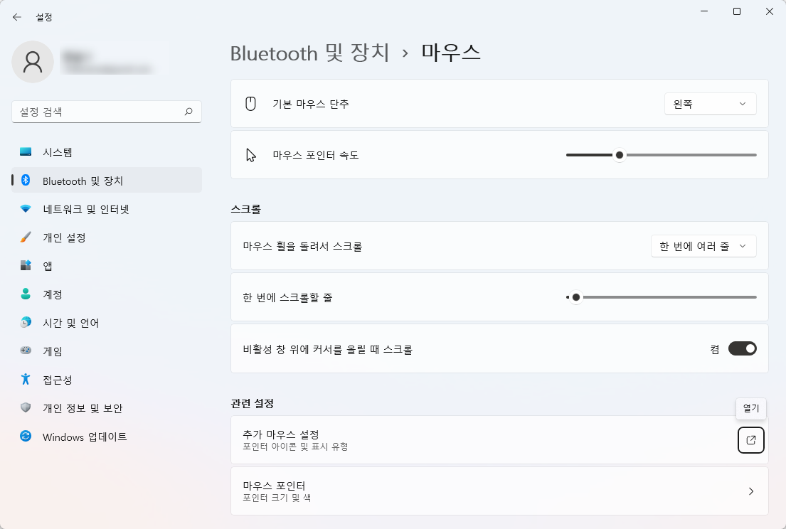 그런 다음 조작해서 마우스 설정 창으로 이동을 해주세요.