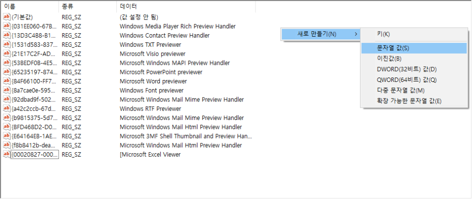 나오는 탭 중에서 '새로 만들기'를 클릭하고, 그 옆의 '문자열 값(S)'을 클릭해주세요.
