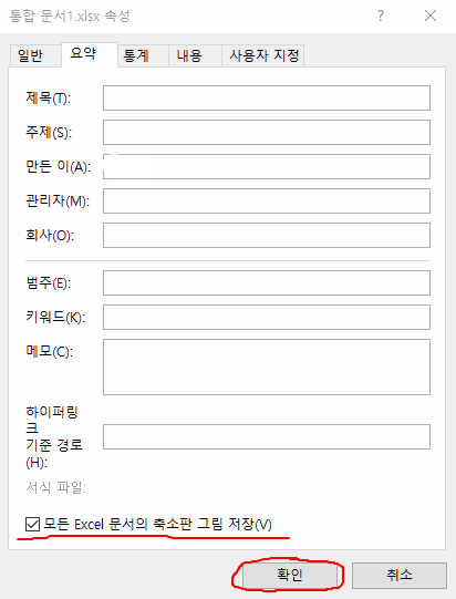 '모든 Excel 문서의 축소판 그림 저장(V)' 설정에 체크를 해주세요.
