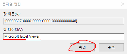 여기서 '값 데이터(V)'의 입력란에 'Microsoft Excel Viewer'를 입력하고, 우측 하단에 '확인' 버튼을 클릭해주세요.