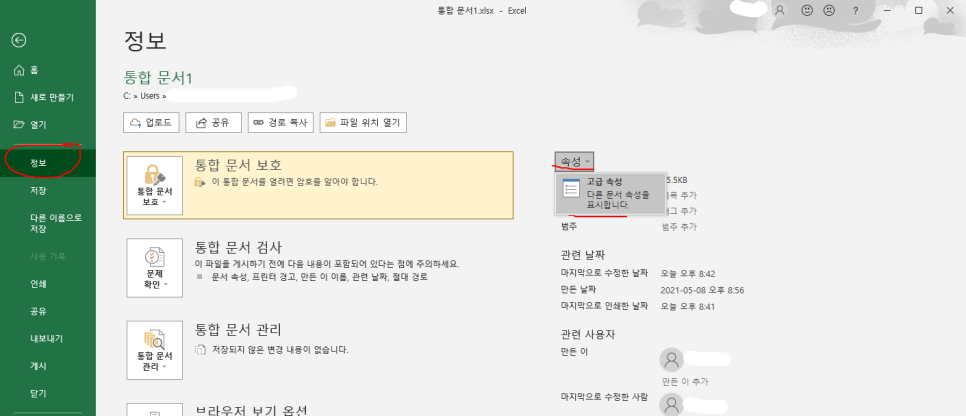 그러면, 위의 사진처럼 해당 문서에 대한 속성 창이 나옵니다.
