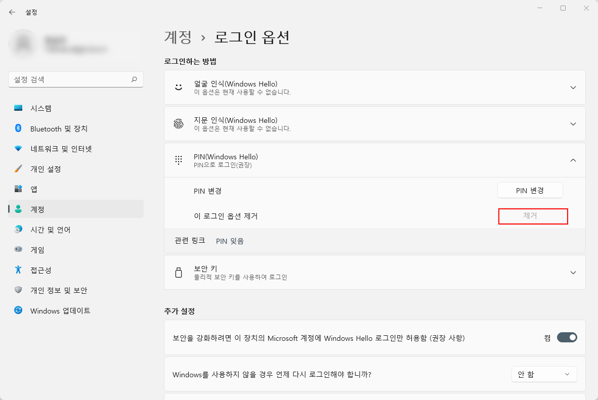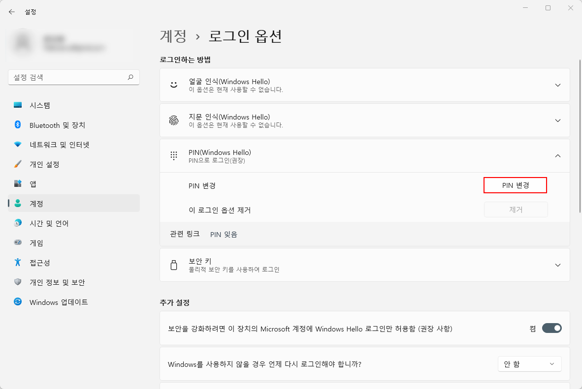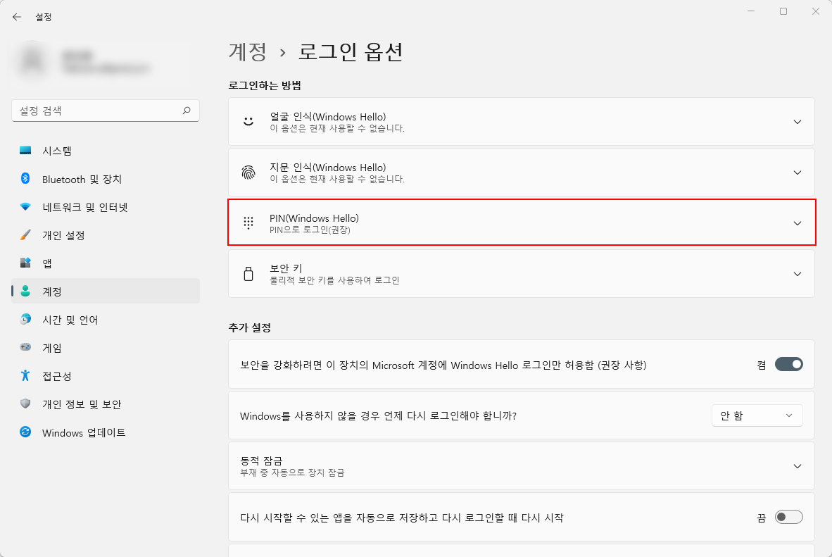 여기서 상단 '로그인하는 방법' 항목의 'PIN(Windows Hello)' 옵션을 클릭해주세요.