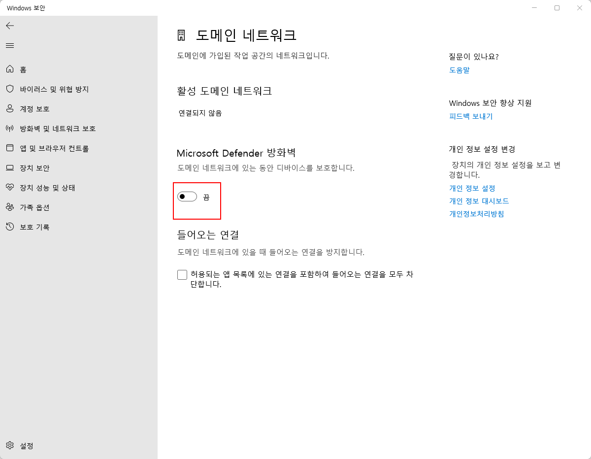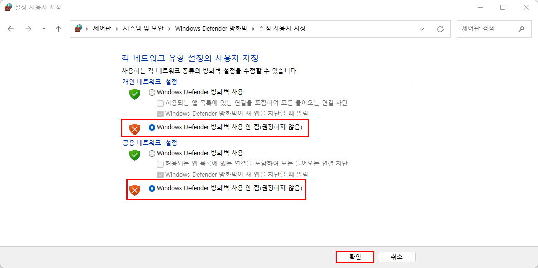 그렇게 하면 이제 이 윈도우11의 방화벽이 완전하게 해제된 것입니다.