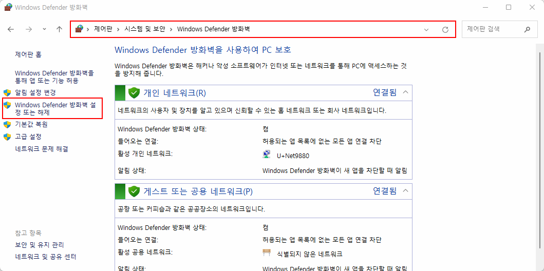 윈도우11의 방화벽을 해제하려면 두 가지의 방화벽 설정을 해제해야 합니다.