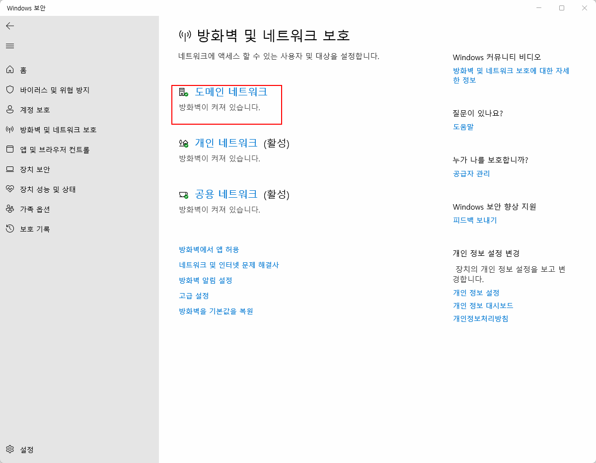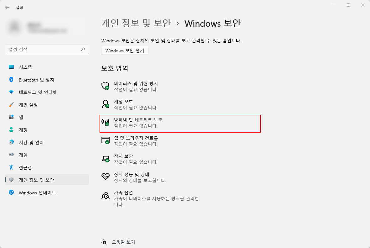 그렇기에 '보호 영역' 항목의 '방화벽 및 네트워크 보호' 버튼을 클릭하도록 합시다.