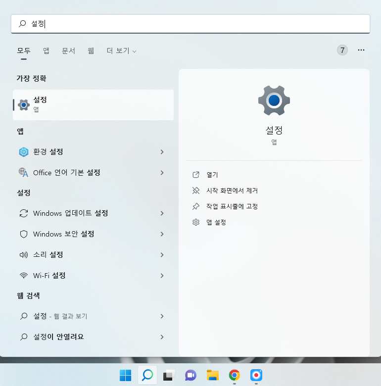 그런 다음, '설정'이라고 입력하고 첫번째로 나오는 '설정' 앱을 실행합시다.