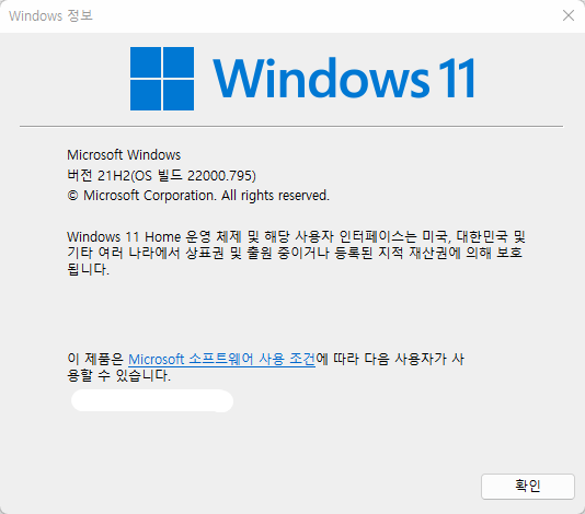 그러면 위와 같이 'Windows 정보'라고 하는 창이 나올 겁니다.여기서 상단 부분을 보면, 내 PC 윈도우의 버전이 나옵니다.상단에는 윈도우11이라고 나오고, 그 아래에는 윈도우 업데이트 버전이 나오죠.