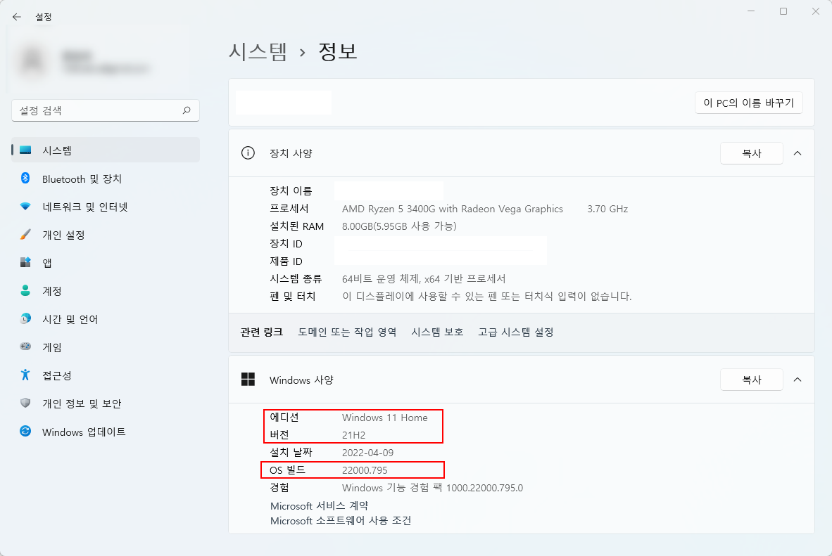 아래에 'Windows 사양'이라고 나와있죠. 윈도우 버전을 확인할 수 있습니다.