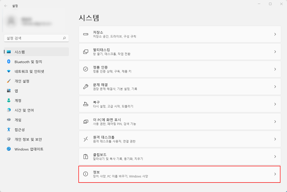 클릭하면 위와 같은 '시스템 > 정보' 창으로 넘어가질 겁니다.