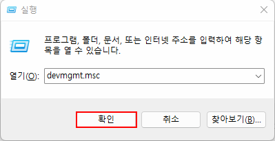 이 창에서 '열기(O)' 옆의 입력란에 'devmgmt.msc'라고 입력하도록 합시다.