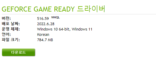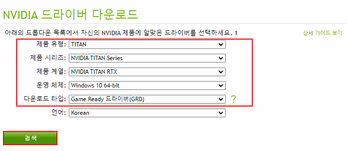 위와 같은 페이지로 이동해서, 'NVIDIA 드라이버 다운로드' 항목의 값을 설정해주세요.