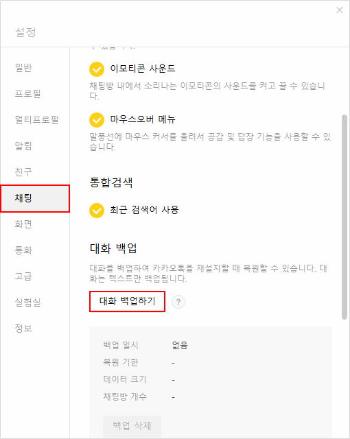 그리고 우측에서 스크롤을 내려서 '대화 백업' 항목의 '대화 백업하기'를 클릭해주세요.