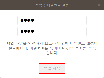 둘이 동일하고 간단한 자주 쓰는 암호를 입력하고, '백업 시작' 버튼을 클릭합시다.