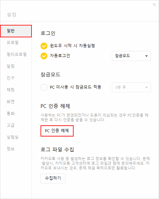 설정의 '일반' 항목에서 'PC 인증 해제' 버튼을 클릭해서 인증 해제를 하고,