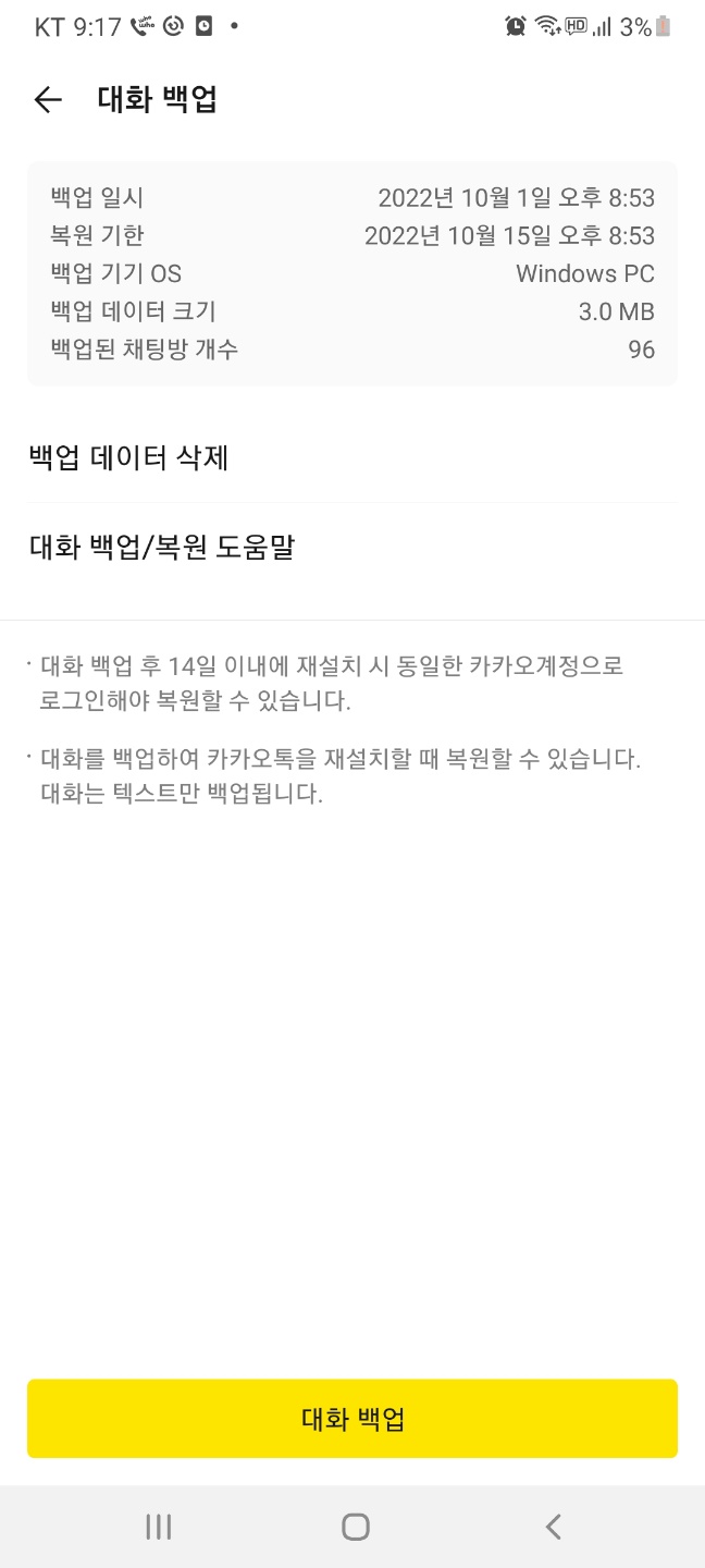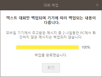 이제 백업이 완료된 것입니다. 이 백업을 통해서 대화내용을 복구할 수 있습니다.