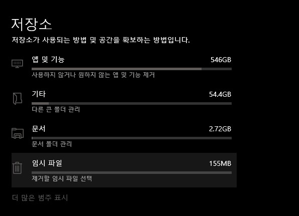 저장소에서 들어오시면 사용자의 뭐가 들어있는지 디스크 세부 사항을 알려주는데 여기서 임시 파일을 클릭하여 줍니다.