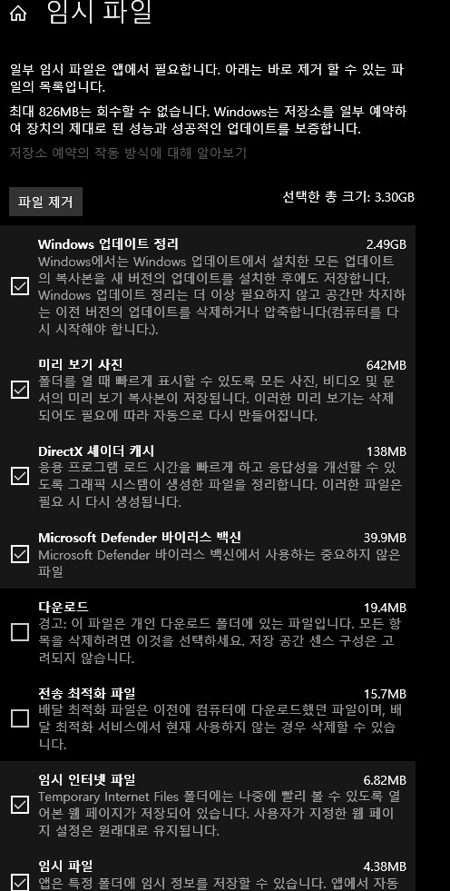 들어오면 사용자께서 임시 파일로 얼마나 저장 되있는지 확인 하실 수 있습니다. 여기서 체크박스에 잘 선택하시고 지우시면 됩니다. 주의 할것으로 다운로드나 휴지통의 경우 임시 파일로 처리되어 사라질 수 있으니 조심하시길 바랍니다.