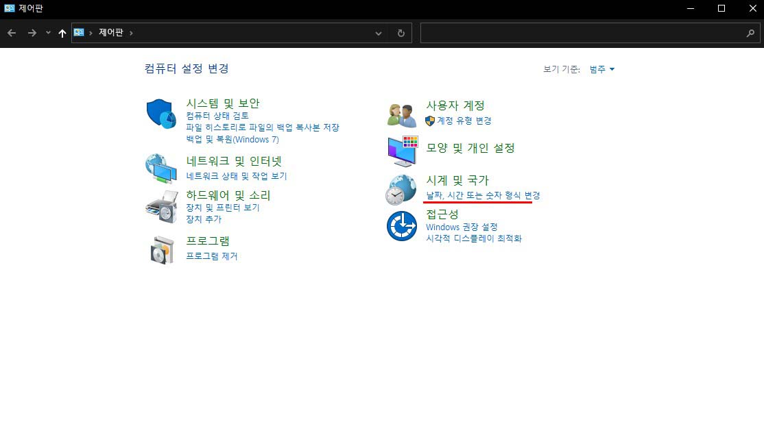 제어판에서 우측 상단에 보기 기준:을 범주로 해주신 다음 시계 및 국가 밑에 있는 날짜, 시간 또는 숫자 형식 변경을 클릭해 줍니다.