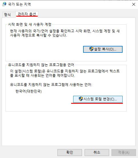 그럼 지역 설정 창이 뜨며 유니코드를 지원하지 않는 프로그램에서 텍스트를 표시할 때 사용할 언어(시스템 로캘)를 선택합니다. 이 설정은 모든 사용자 계정에 영향을 줍니다.라는 설정 창으로 현재 시스템 로캘(c)에서 아래에 한국어(대한민국)를 선택하신 뒤 확인 버튼을 눌러 나와 주시면 됩니다.