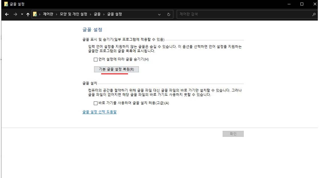 그럼 글꼴 설정으로 오게 되며 여기서 기본 글꼴 설정 복원(R) 버튼을 눌러 복원하여 줍니다.