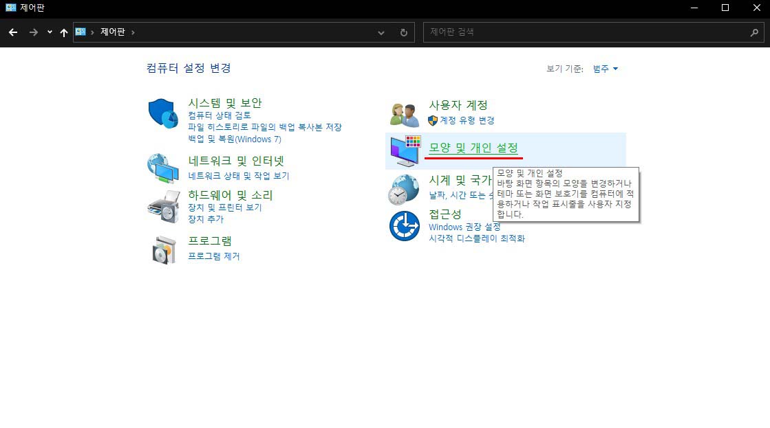 그리고 모양 및 개인 설정으로 들어가 줍니다.