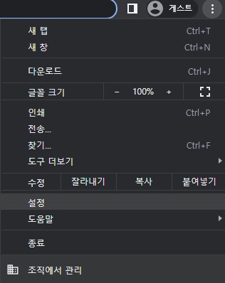 먼저 크롬 웹브라우저를 실행시킨 다음 우측 상단의 설정 버튼을 클릭해 설정창으로 진입하여 줍니다.