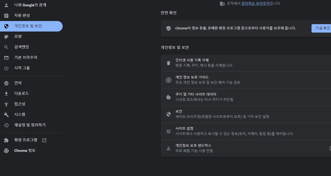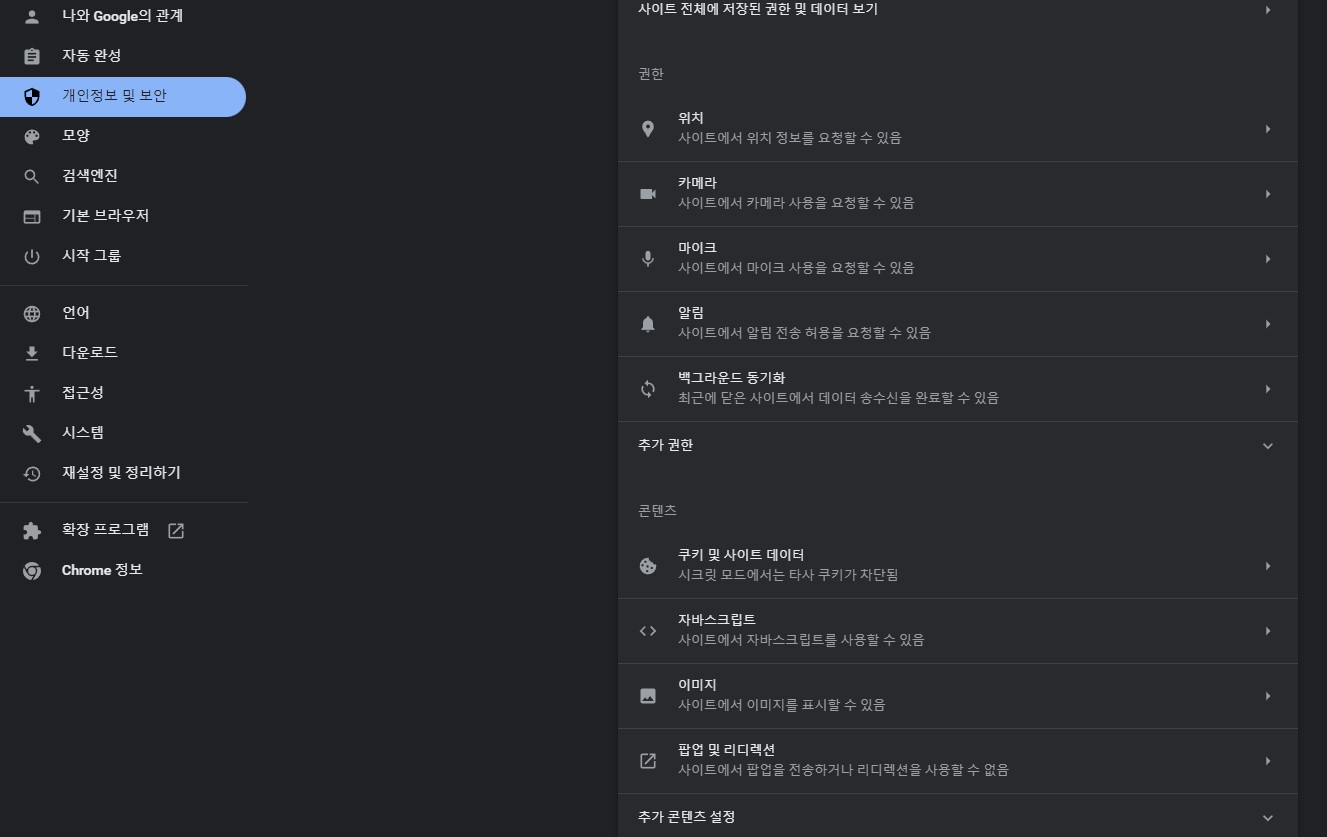 설정창으로 오시면 좌측 메뉴바에서 개인정보 및 보안을 클릭한 뒤 사이트 설정(사이트에서 사용하고 표시할 수 있는 정보 등을 제어합니다.)를 클릭해 진입하여 줍니다.